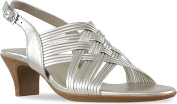 Crisscrossing leather straps elevate an elegant slingback sandal with a comfortably cushioned footbed and just-right stacked heel.