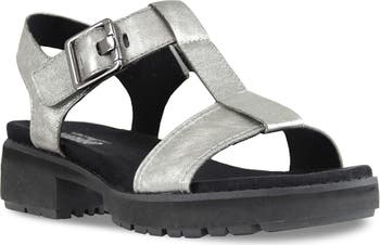 A lug sole brings enhanced traction to a T-strap leather sandal set on a comfy contoured footbed.