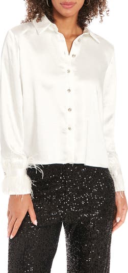 Feather-embellished cuffs and sparkly rhinestone buttons glam up this crepe-back satin shirt that's perfect for an elegant night-out look.