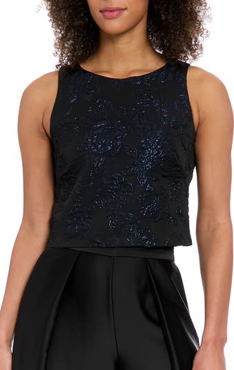 Bring instant romance to your look with this shimmery floral jacquard top cut in a fitted, cropped silhouette.