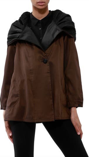 Get two looks in one with this reversible rain coat fashioned with a pleated shawl collar that converts to a hood and a swingy A-line silhouette.