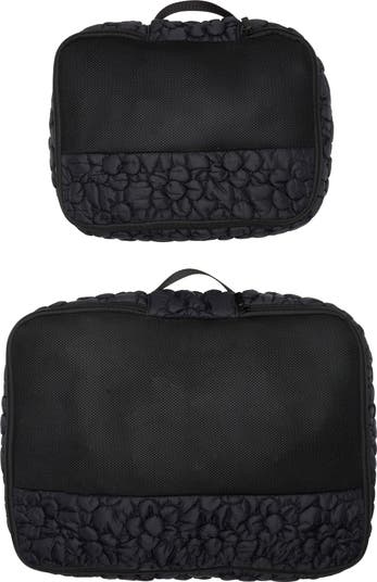 Maximize the number of wardrobe options you need to bring on your next trip with this set of two packing cubes designed to compress your soft essentials.