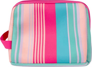 A stylish and spacious cosmetic case that ready for travel includes reusable product bottles and is fashioned with inner mesh pockets and a handle for easy carrying.
