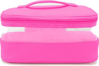A spacious cosmetics case designed with a carry handle and clear panel will keep your cosmetics secure on the go.
