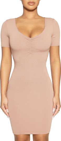 A ruched bust enhances the allure of a short-sleeve minidress constructed from midweight crepe in a body-con silhouette with comfortable stretch.