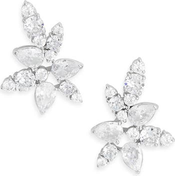 Round and pear-cut cubic zirconia bring glamorous sparkle to these clustered stud earrings plated in polished rhodium.