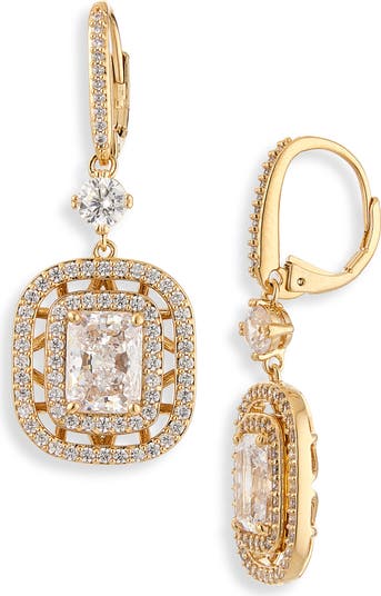 Sparkly cubic zirconia illuminate these double-halo drop earrings that bring instant glamour to your night-out looks.