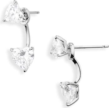Cubic zirconia hearts sparkle from romantic front/back stud earrings plated in warm 18-karat gold or rhodium for elegant shine.