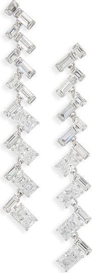 Baguette crystals create a dazzling, modern statement on linear drop earrings plated in 18-karat gold.