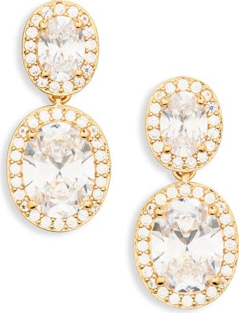 Shimmering cubic zirconia define the center and halo of these drop earrings warmly plated in 18-karat gold.
