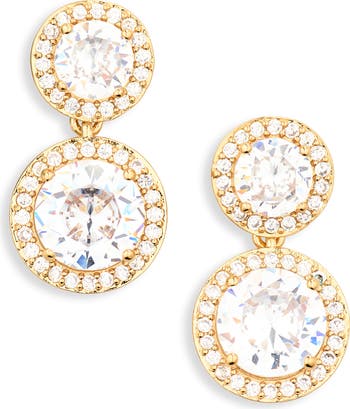 Cubic zirconia define the halo and center on double-drop earrings warmly plated in 18-karat gold.