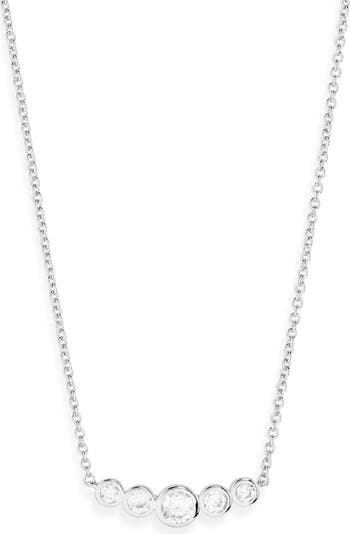 Bezel-set round cubic zirconia illuminate this graduated bar pendant necklace featuring a polished rhodium finish for elegant shine.