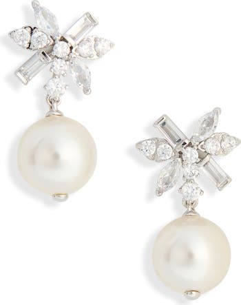 A cluster of cubic zirconia stones suspends lustrous faux pearl drops in these earrings perfect for elevating your daytime or evening ensembles.