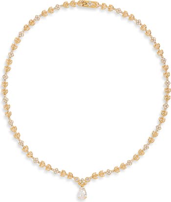 Bring botanical shine to your neck with this V-shaped necklace boasting pavé leaves and a teardrop crystal.