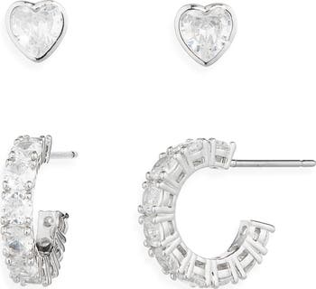 Sweeten your ear stack with the heart-shaped studs and crystal-adorned hoops in this two-piece set complete with a high-shine finish.