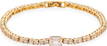 An emerald-cut cubic zirconia sparkles from this stunning flex bracelet encircled with shimmering round crystals.