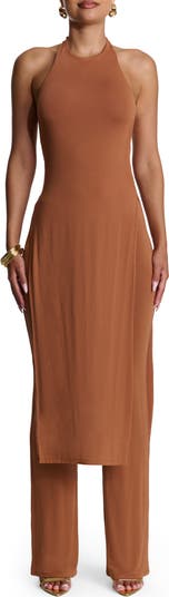 Soaring side slits give fluttery movement to this stretchy jersey halter tunic with extralong ties and a longline silhouette that brings the drama.