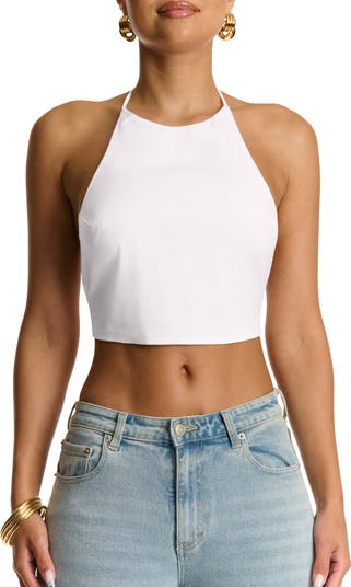 A breathable cotton-infused crop top is styled with a cute halter tieback neckline and finished with stretchy elastic smocking at the back to keep the fit comfy.