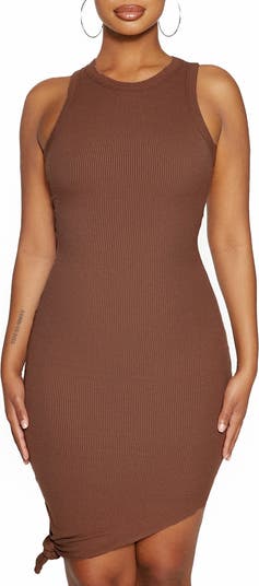 A tied, asymmetric hem and a second-skin fit style this captivating, curve-enhancing tank dress made from a stretchy knit.