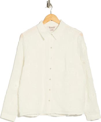 Dimensional blooms bring a dose of sweetness to a button-up shirt that makes a posh choice for workdays to weekends.