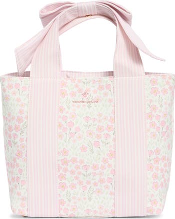 Striped, bow-topped carry handles highlight the structured silhouette of this roomy tote woven from flower-patterned fabric and finished with a gingham lining.