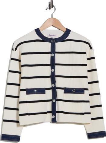 Denim trim plays up the casual vibe of this soft ribbed cardigan fashioned with an easy front-snap closure and handy pockets.