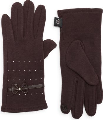 Add a toasty touch of refined glamour to your cold-weather look with these sleek gloves adorned with faux leather bows and studded accents.