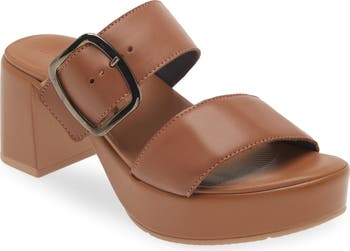 A buckled instep strap adds modern allure to a leather slide sandal lifted by a chunky platform and block heel.