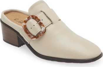 A tortoiseshell-patterned buckle charms the strap of this elegant leather mule lifted on a cushioned footbed and chunky block heel.