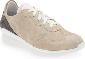 Earthy tones create a neutral look on a colorblock sneaker that's designed with a slip-resistant sole and arch support.