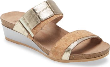 An arch-supporting, cork-and-latex–cushioned footbed ensures lasting comfort in a breezy wedge sandal topped with mixed-texture straps.