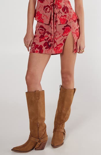 In this barely there miniskirt with a breezy front slit, romantic blooms show up for all your night out adventures.