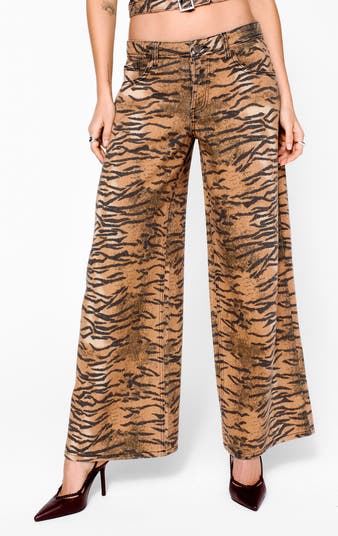 A fierce tiger stripes enhance the cool vibes of low-waist, nonstretch-denim jeans cut in a straight-leg silhouette.