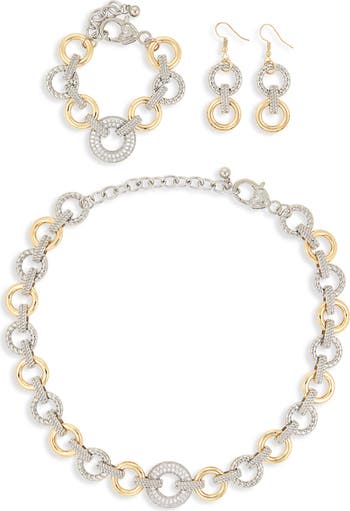 A striking two-tone finish and shimmering bright-white crystals define a matching set of a necklace, earrings and bracelet that can be worn together or separated for a minimalist approach.
