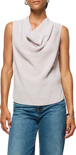 Narrow stripes lend subtle texture and sophistication to a cowl-neck tank that's an elevated casual staple.