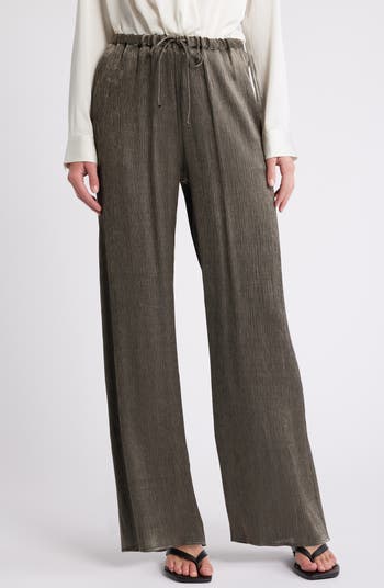 Level up your laid-back look in glossy drawstring pants textured in fine plissé pleats and finished with wide, flowy legs.