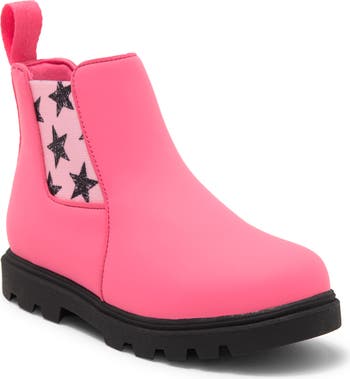 Deep, ribbed goring panels make for easy pull-on and stay-on in this kid-size Chelsea boot set on a grippy lugged tread.