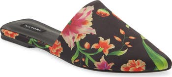 Luscious blooms dance across the vamp of a breezy satin mule carried by a slim leather-lined footbed.