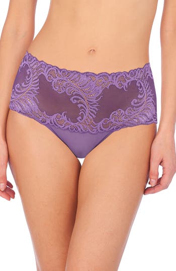 An intricately embroidered feather pattern romances stretchy mesh briefs.