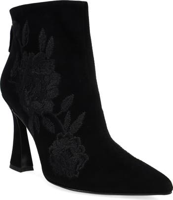 Charming floral embroidery details a creamy suede bootie balanced by a pointy toe and flared heel.