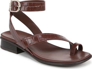 An asymmetric vamp strap and stylish toe ring create modern dimension on a cushioned sandal balanced by a square toe and modest block heel.