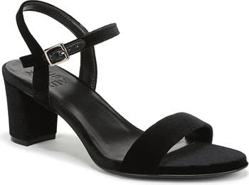 An open toe and wrapped block heel balance a sleek velvet sandal fashioned with a svelte ankle strap for a secure fit.