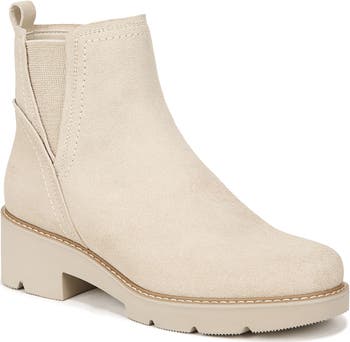 A side goring inset and rear pull-tab lend easy wear to a water-repellent bootie lifted by a subtle platform and chunky block heel.