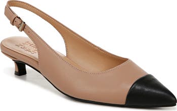 A cute kitten heel gives an on-trend finish to a pointed-toe pump with a slingback strap.