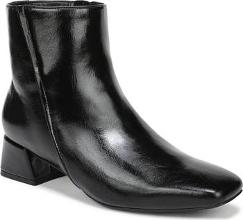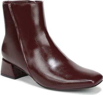 A square toe and block heel balance a sleek patent bootie fashioned with a side zipper for easy entry.