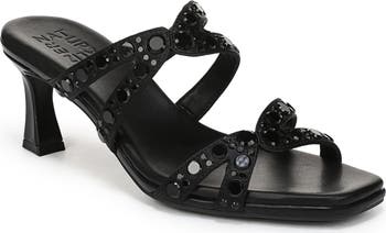 Glam up your look with this comfortably cushioned dress sandal illuminated by sparkly rhinestone-embellished straps and lifted by a modest heel.