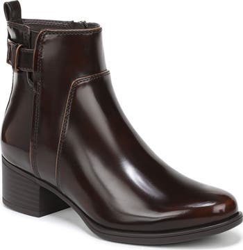 A demure almond toe and block heel balance a sleek buckle-adorned bootie fashioned with a side zipper for easy entry.