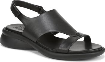 Geometric side cutouts and sleek faux leather distinguish a sporty sandal fashioned with an adjustable slingback strap for a secure fit. Reimagined Contour+ Comfort technology offers pressure distribution, less fatigue and longer wear.