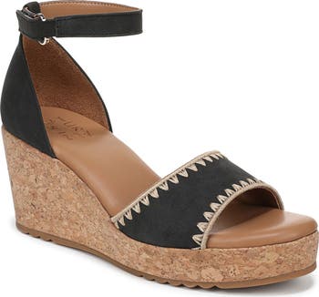 Contrast whipstitching and a lightweight cork heel adds a beachy finish to a platform-wedge sandal finished with a well-cushioned footbed.