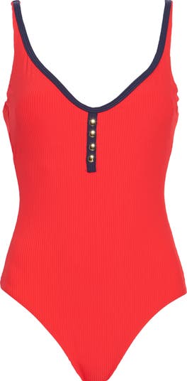 Gleaming buttons highlight this ribbed one-piece swimsuit that's framed by adjustable straps for a comfortable fit.